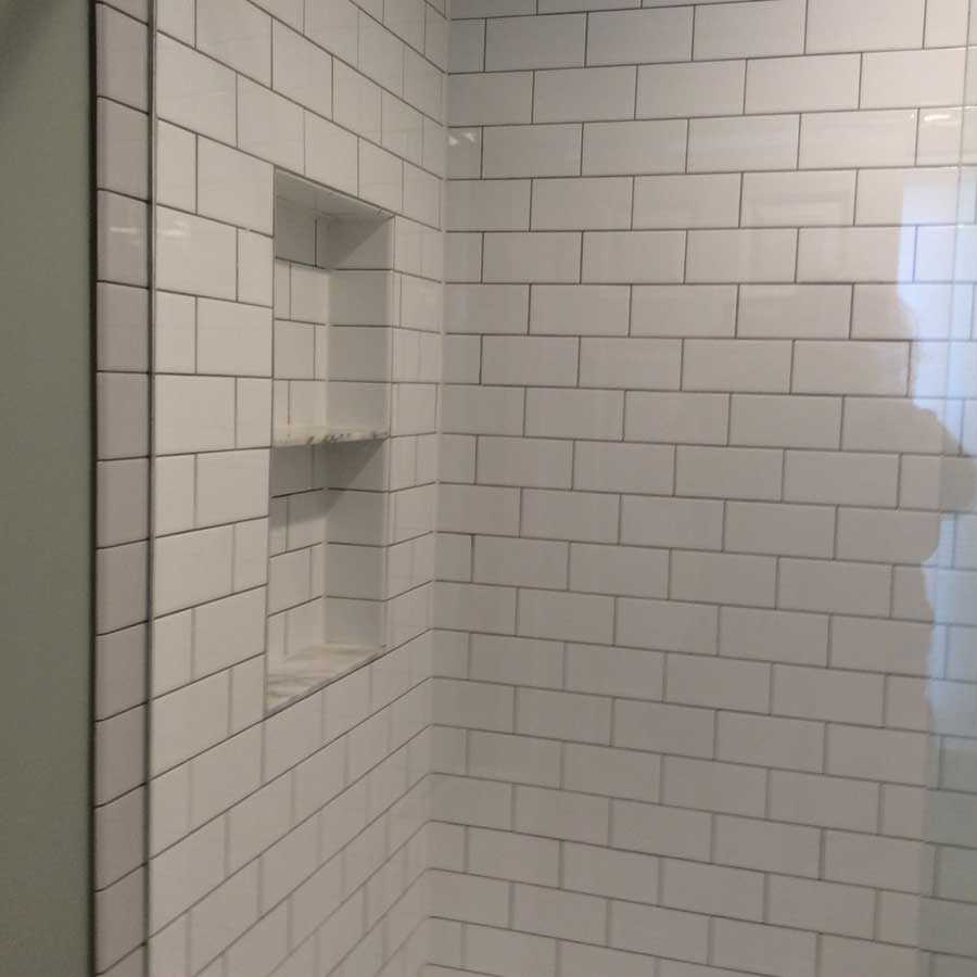 Lovely 1920s home with very small spaces for bathrooms. Reimagined to modernize the looks and make best use of space. Sliding glass, subway tile and beautiful hexagon grey tiles. Quartz sink in modern square style. Basement bath makes great use of space with a molded marble shower stall with glass door and molded marble sink.